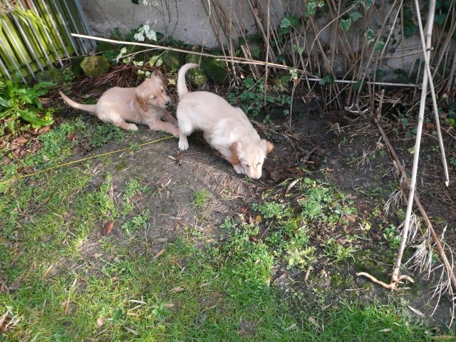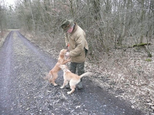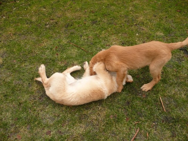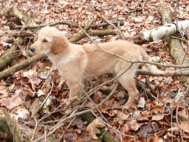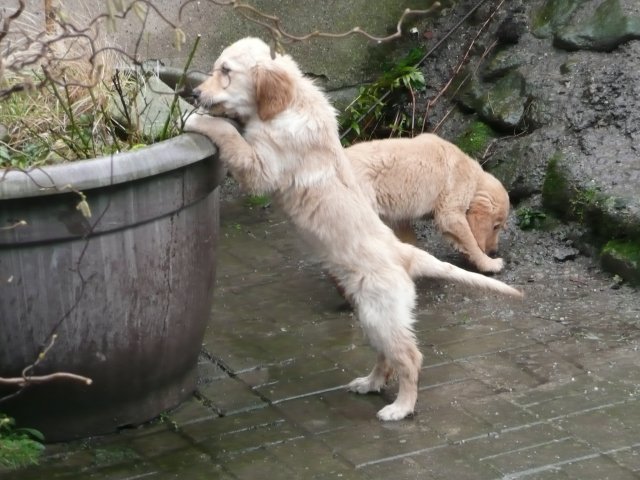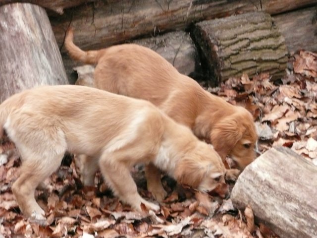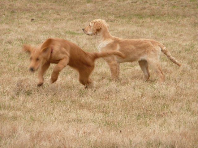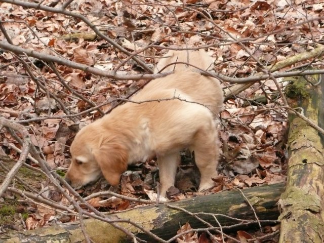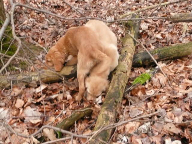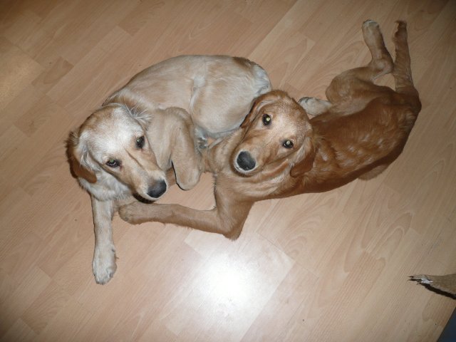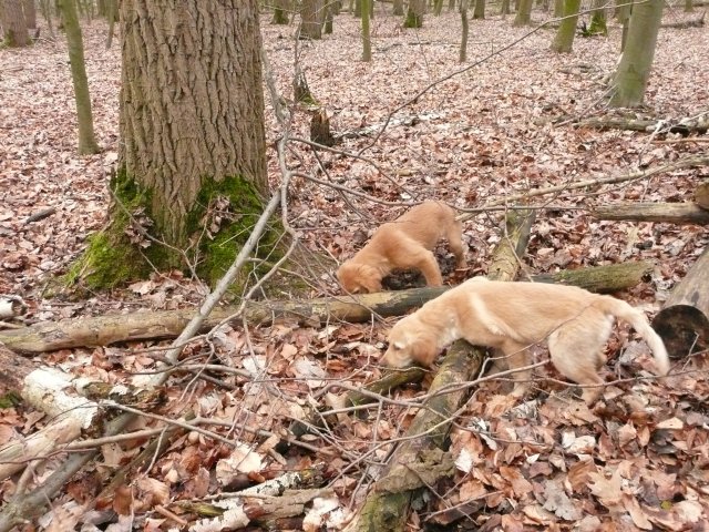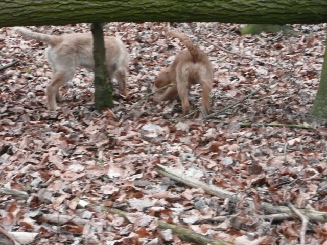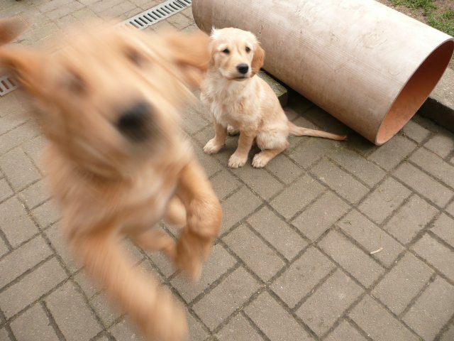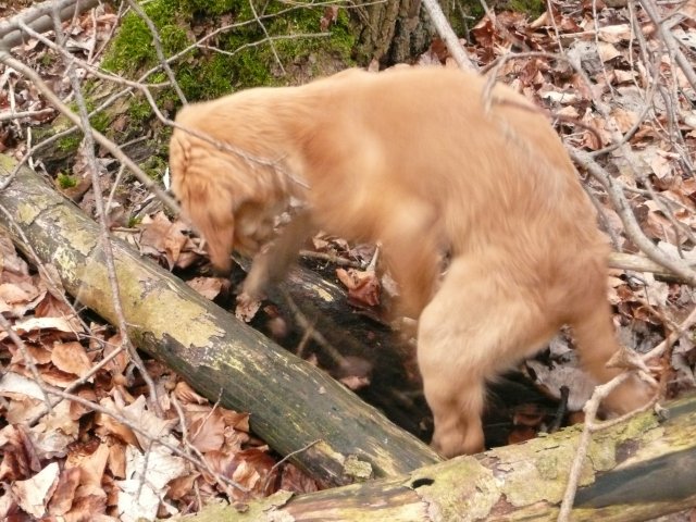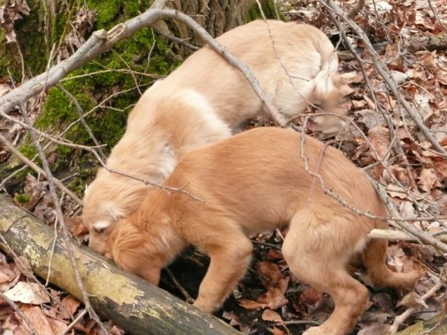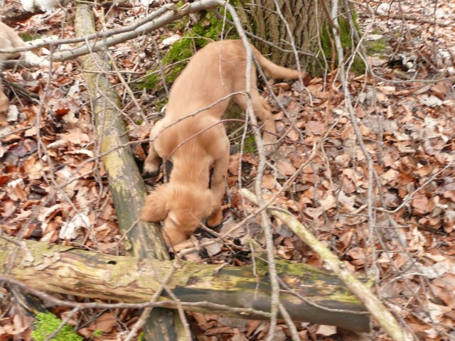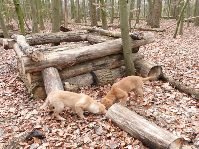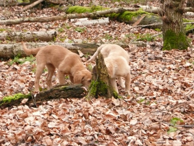 Von einem unserer Geländegänge am 27.03.2012 habe ich zwei kleine Filmchen mitgebracht. Leider konnte ich selber am Wasser keine Aufnahmen machen, ich muß mir einmal jemanden mitnehmen der die Kamera führt. Wasser ist für die Beiden kein Problem, sie springen mit einem Riesensatz hinein und fühlen sich darin wohl. Als eine Gruppe anderer Hunde kam, sind wir in den Wald und da ist dann ein kleines Filmchen entstanden. Leider läuft von der Filmbearbeitung der Ton nicht synchron...also nicht wundern, Bild und Ton passen nicht zueinander. Nachdem dann die Großen ihren Spass hatten, durften Pippa und Phillis noch einmal über die Wiese toben.