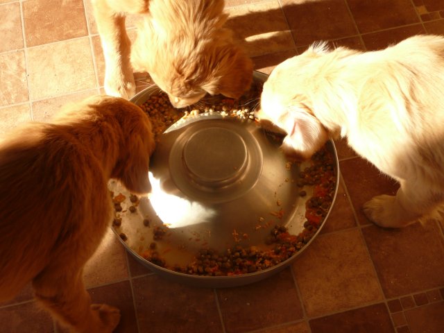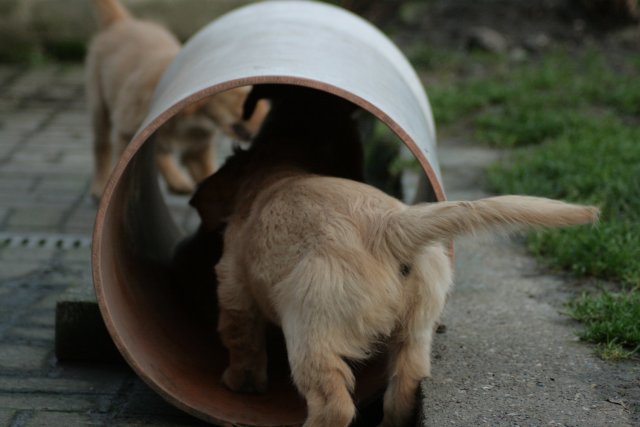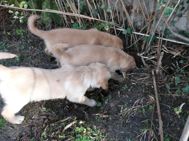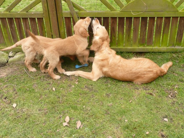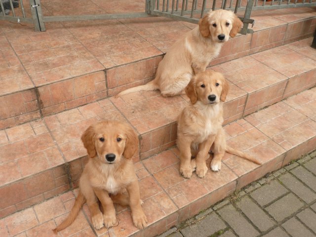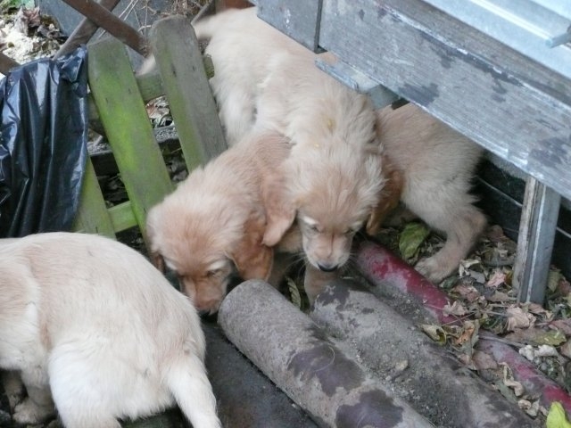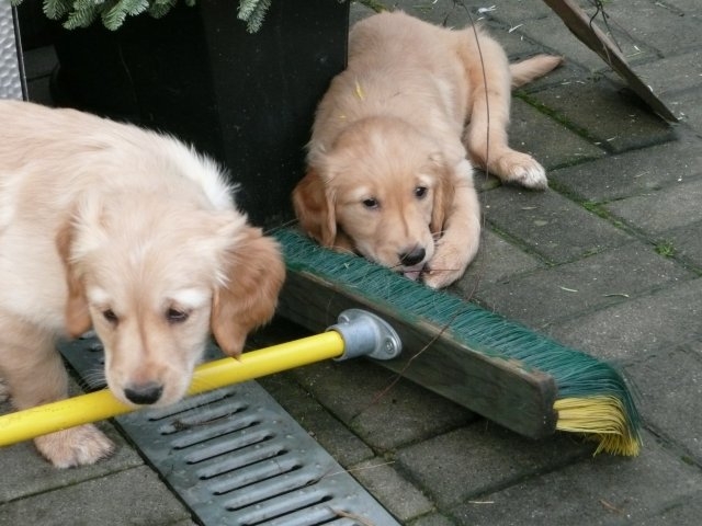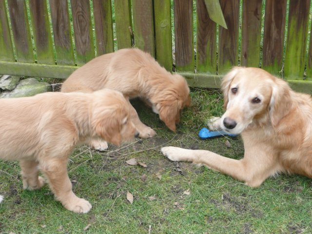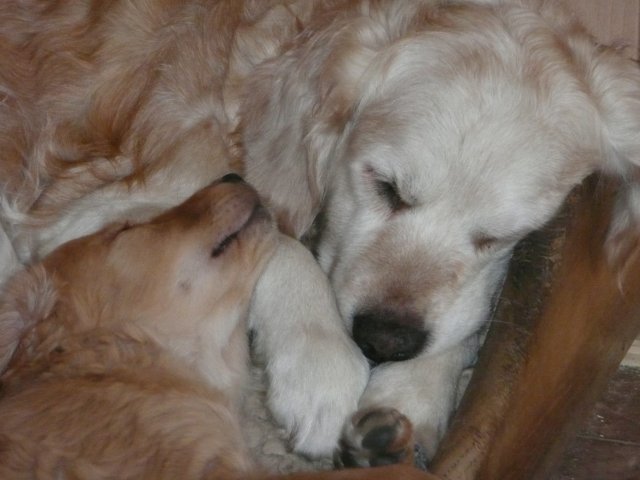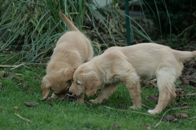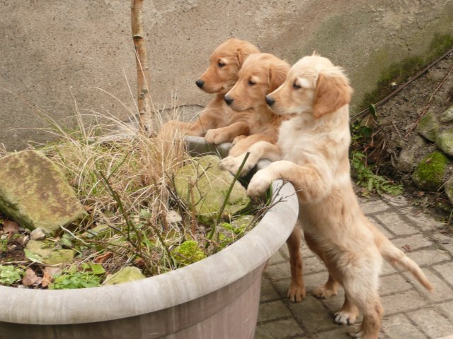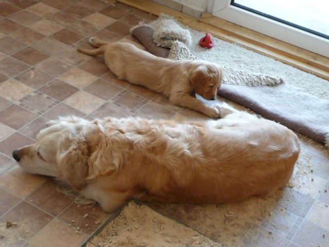 Hier einmal ein Filmchen von Montag den 30.01.2012. Sah man doch bisher auf den Videos immer Welpen in Action, so sieht man hier....sie können auch anders. Es ist zwar nicht so spektakulär aber es zeigt, das die Welpen auch einen normalen Bewegungsdrang besitzen ;-) Der hörte allerdings auf, als Genna und Onia dazu kamen...da konnte ich nicht weiterfilmen...da brauchte ich alle Hände um die wilde Bande zu bändigen und wieder zu trennen. In der Wohnung ist das alles halb so wild, da hält Onia sich noch etwas zurück, aber im Freien ist sie mir dann doch zu wild und ich möchte ja nicht, das die Kleinen sich verletzen.....aber sie lieben sich heiß und innig.