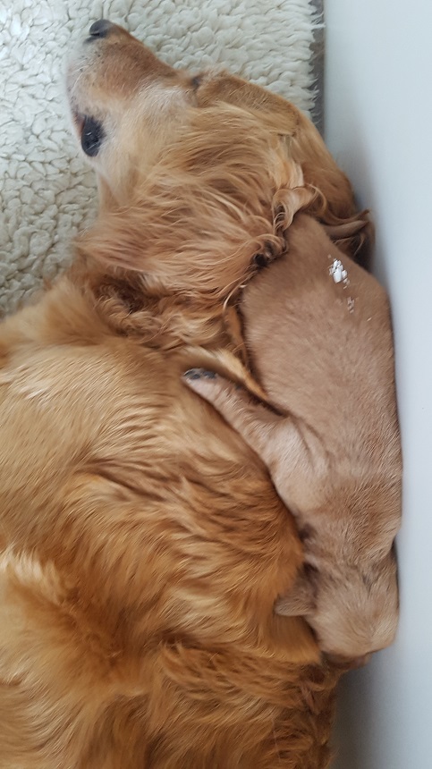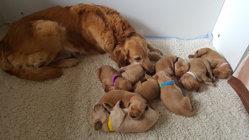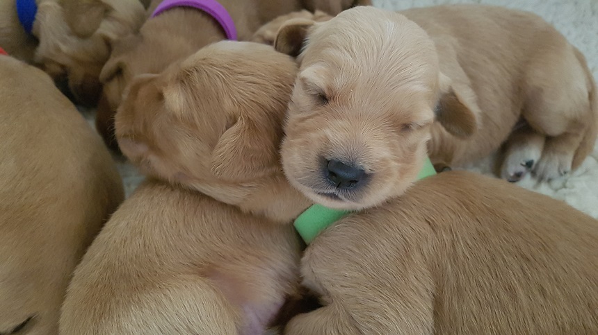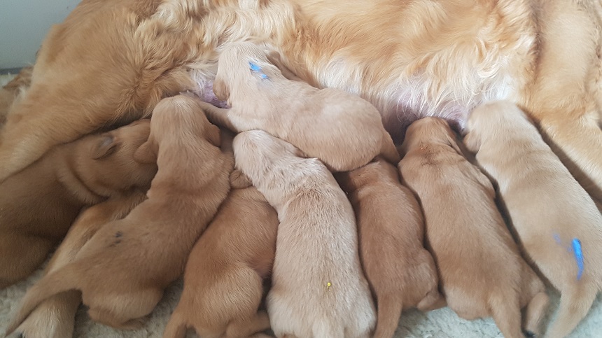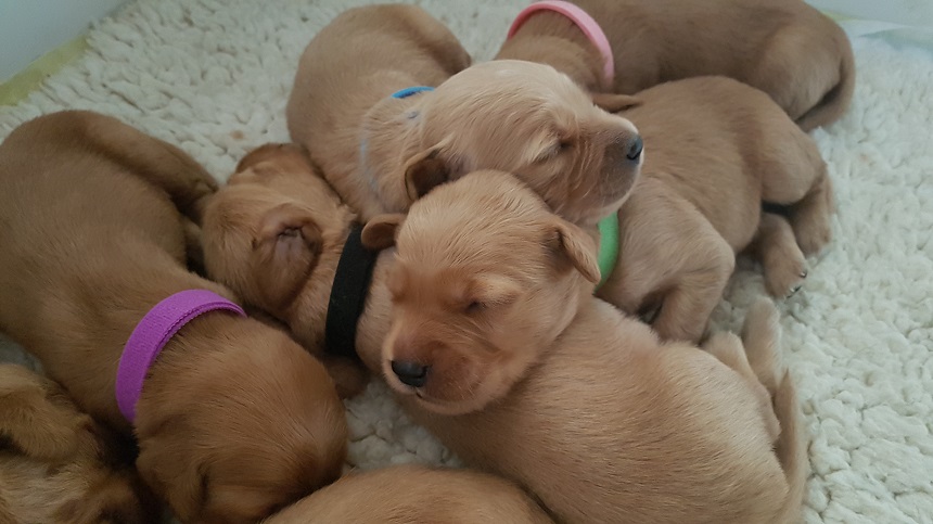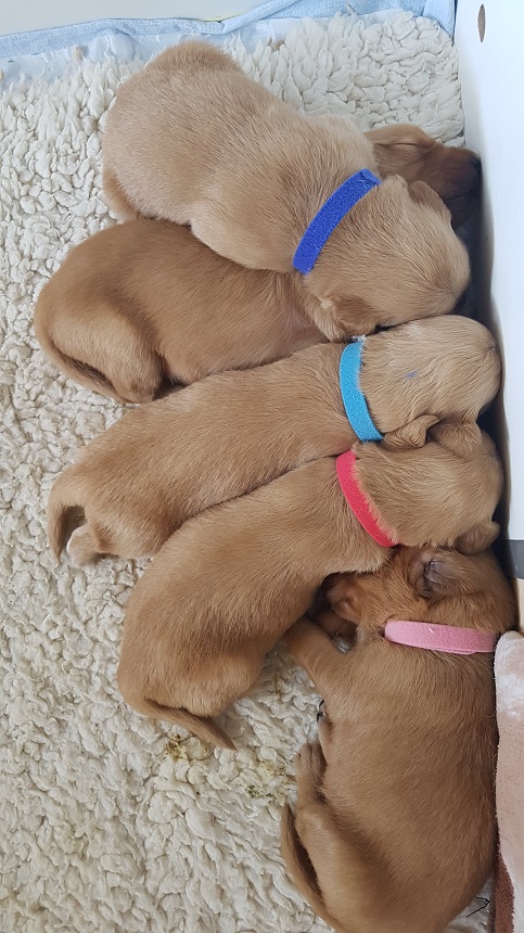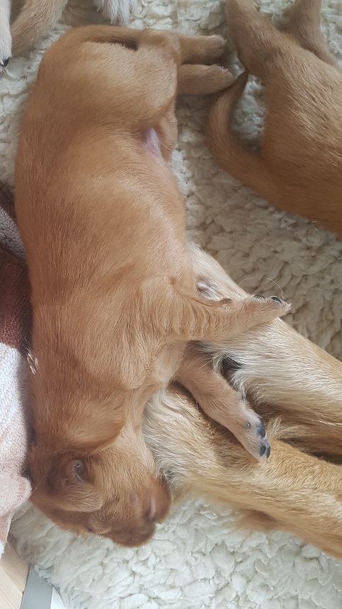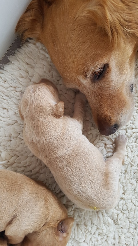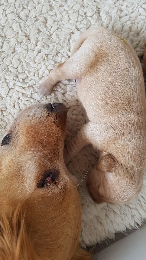 Die zweite Woche verlief ruhig...Mutter und Kinder sind gesund und noch sehr pflegeleicht. Sunny kümmert sich nach wie vor sehr gut und hält ihre Kleinen sehr sauber. Seit Mitte der Woche schläft sie schon wieder öfters neben meinem Bett aber so bald die Kleinen einen Mucks von sich geben schaut sie nach dem Rechten. Die Abstandshalter in der Wurfkiste musste ich entfernen, die Kleinen machten schon Klimmzüge daran und ich hatte Angst, dass sie sich darin einklemmen. Mittlerweile sind sie so groß dass sie sich lautstark bemerkbar machen, sollte Sunny sich zu eng an die Wand legen.