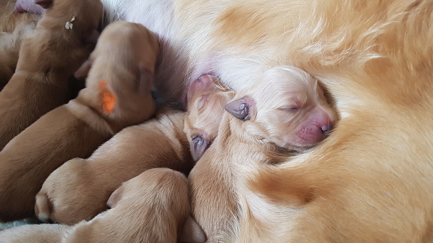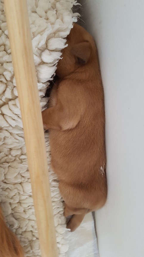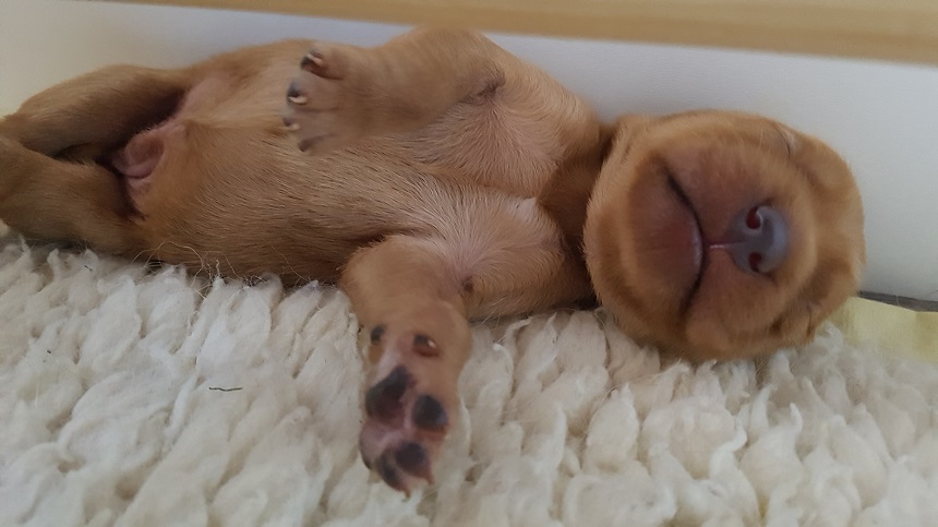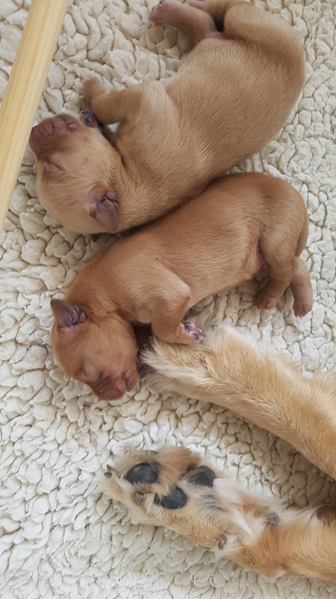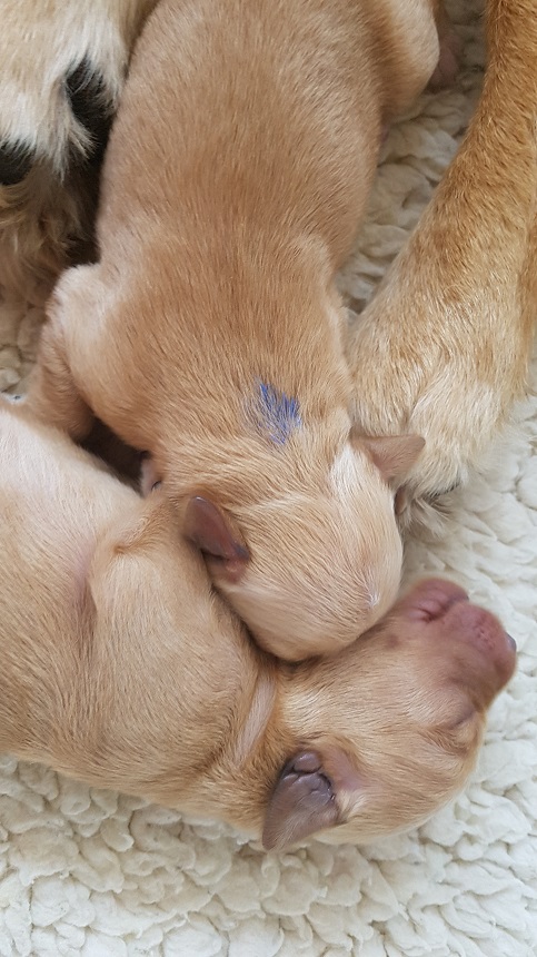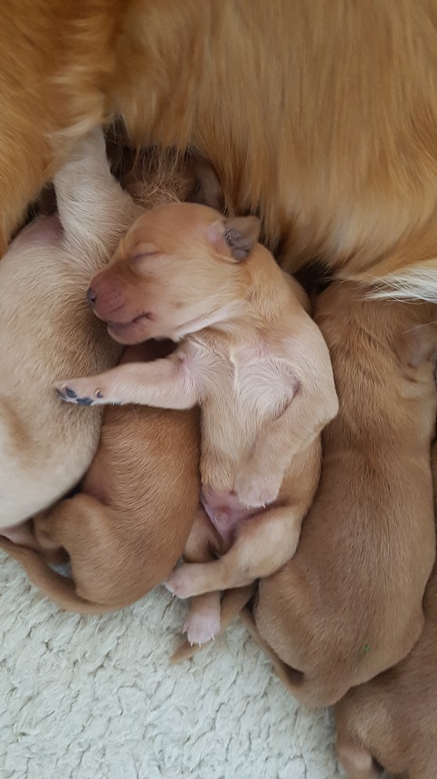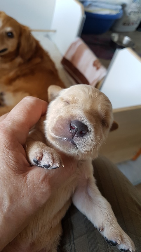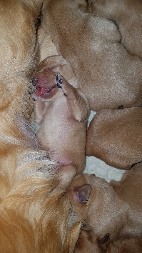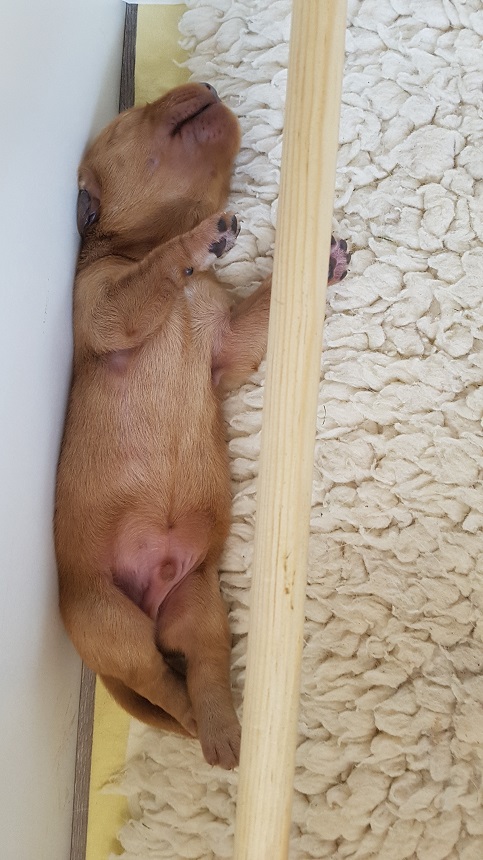 Ich könnte jetzt schreiben...schon die 1. Woche um, es klingt so abgedroschen...aber da ich immer einen Wochenbericht schreibe geht es um die 1. Woche. Nach einer gesunden, normalen Geburt ist der Ablauf immer etwas ähnlich. In erster Linie gilt der Mutter unsere Aufmerksamkeit, ist sie gut versorgt, ist das Gesäuge weich und gibt jede Zitze Milch? In den ersten Tagen benötigen die Welpen noch keine große Menge Milch daher darf das Gesäuge noch nicht so voll sein. Die Welpen würden es nicht austrinken und das Gesäuge könnte sich durch den Milchstau entzünden. Bei den Welpen müssen die Nabel kontrolliert werden...ob sie gut abgetrocknet sind und keinen Nabelbruch haben. Nach einigen Tagen geht alles in Routine über. Sunny ist wie bei ihren vorherigen Würfen eine vorbildliche Mutter. Eine Herausforderung in diesen Tagen sind die Temperaturen, Sunny sucht schon den kühleren Boden außerhalb der Wurfkiste zum Schlafen auf. Selbst die Welpen liegen selten dicht zusammen, sie suchen auch den kühleren Rand der Kiste...wo das Vetbed einen Rand vom Boden frei lässt, da schieben sie sich hin.