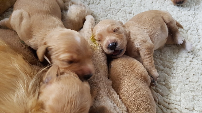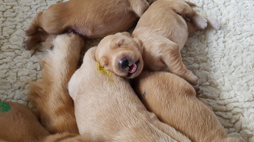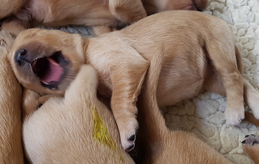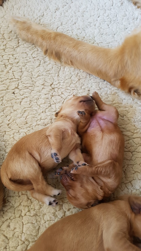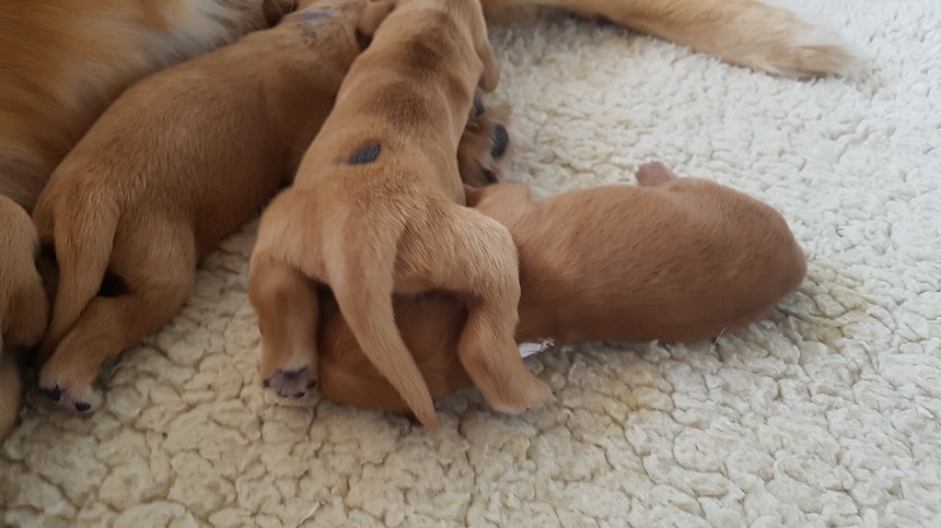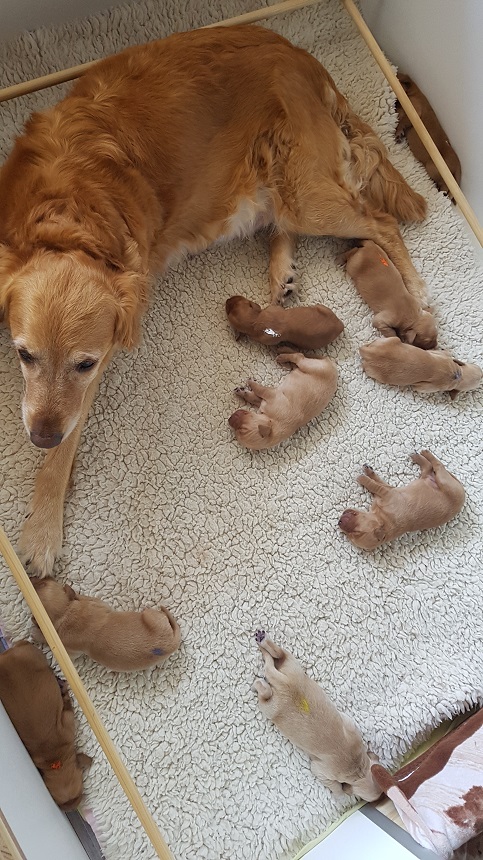 Heute mit einer Woche, wissen die Welpen schon wo Sunny herein kommt und sie wird sofort belagert