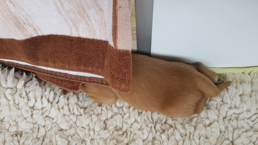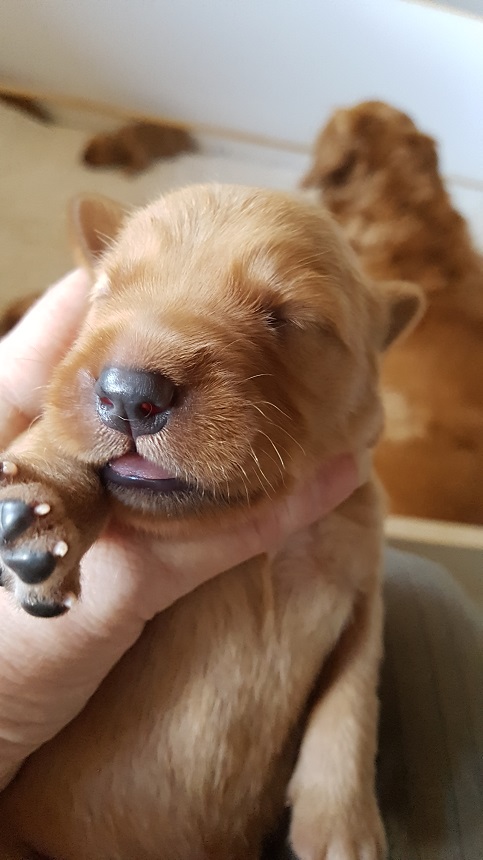 Ihre Bewegungsabläufe machen Fortschritte nur wenn die Bäuche voll sind, schieben sie sich wie fette Raupen in ihre Schlafecke. Obwohl die Augen noch geschlossen sind, verändert sich ihr Gesichtsausdruck täglich...die Schnäuzchen bekommen ihre dunkle Pigmentierung und die kleinen Öhrchen werden immer mehr zu Schlappöhrchen.